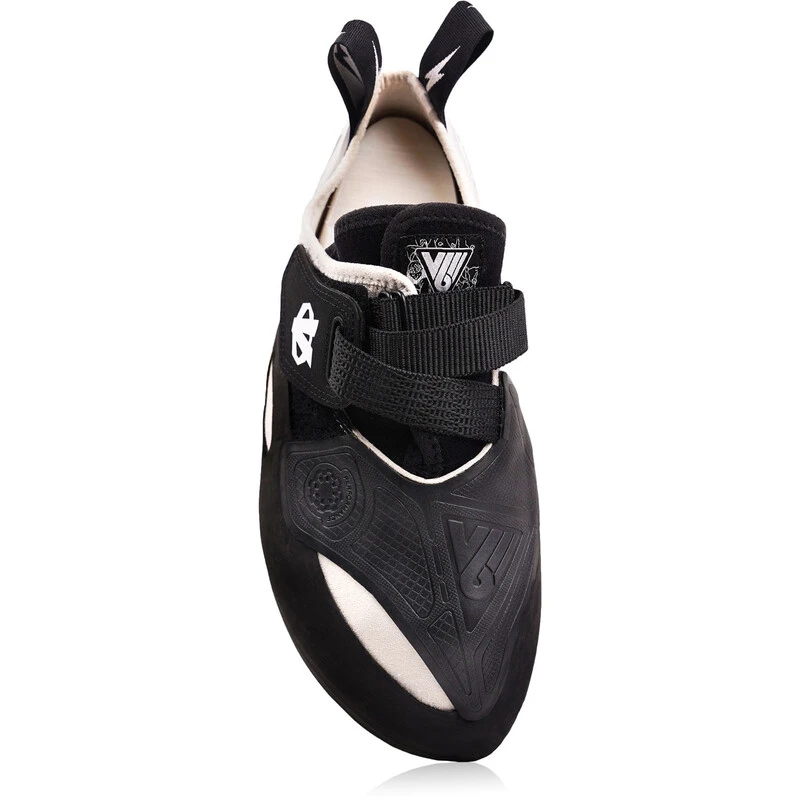 The V6 is made for climbers who want to become experts quickly on any terrain. Its adjustable single strap closure ensures an easy, precise fit and paired with an easy entry split tongue allows climbers to transition between climbs comfortably and quickly. The downturned toe provides precision on steep small holds. It features a large toe patch to provide secure and stable toe hooking. The tensioned heel rand creates a locked in feel for maximum security and precision while heel hooking. Smearing is easy with the even flex of the full-length outsole. The V6 uses Evolv’s proprietary TRAX SAS® rubber compound to ensure superior stickiness on diverse terrain. All materials used in the V6 are 100% vegan. The V6 also comes in a Low Volume to ensure the best fit for a climber’s foot shape and performance goals. The V6 offers a balanced feature set to smear, edge, toe hook and heel hook with immediate comfort out of the box to enable a climber’s quick progression to V6 and beyond.