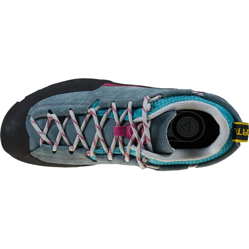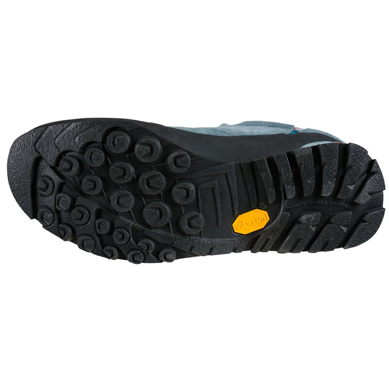 The ultra-sticky Vibram sole with climbing zone and large toe rand makes the La Sportiva Boulder X an excellent choice for tricky approaches, scrambles and via ferrata. The updated and revised sole design provides even more traction while climbing, while the Impact Brake System provides security on slippery descent routes. The soft 2mm EVA insert ensures the best anti-shock qualities. The full rubber rand provides excellent abrasion resistance while climbing, and is great for pasting your feet into cracks. The asymmetric lacing system is inspired by the Mythos climbing shoe, and goes around the heel and down to the toe for a secure, customisable fit.