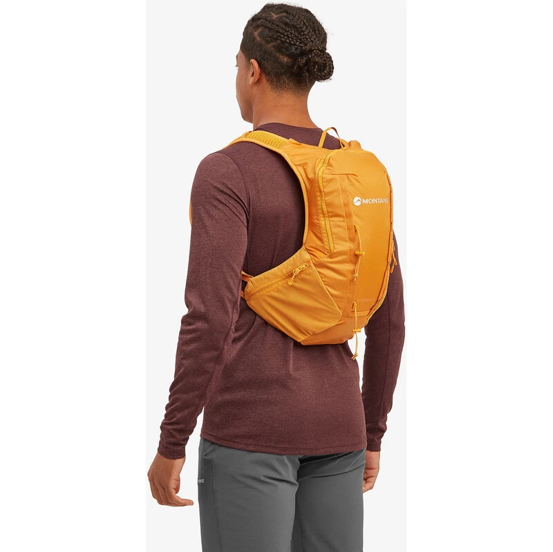 A lightweight, durable 8 litre trail running pack, the streamlined Trailblazer 8 keeps the centre of gravity low while the harness adjusts to fine tune the fit for comfort on the move. The tough nylon outer fabric is 100% recycled and has been coated with a PFC-DWR to shed moisture. Montane’s T-Hooks can be moved to any of the laser-cut holes on each side of the front panel to provide adaptable attachment points for walking poles and spare layers. Pockets up front help to distribute the weight and keep essentials up front for easy access when you’re on the go. Trailblazer 8 is perfect for ultra distance race events or long trail days.